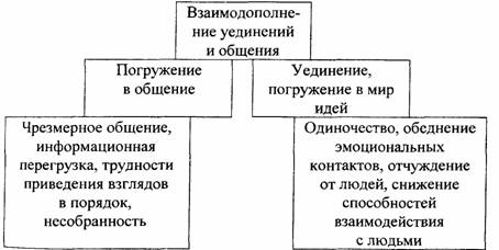 Баланс сознательного поведения и внимания к подсознанию, а также баланс интереса к объекту творчества и самонаблюдения неизбежно выводит на вопрос соотношения общения и уединения. Без уединения самоанализ, самонаблюдение невозможны. Да и самовыражение результатов творчества требует времени, взаимодействие с другими при этом обычно не предполагается. Поэтому следующая группа "выясняемых" отношений - баланс общения и уединении, представлена в схеме ниже: