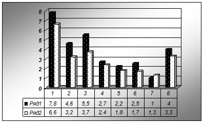 Где: 1 – показатели интро-экстраверсии; 2 – показатели нейротизма.