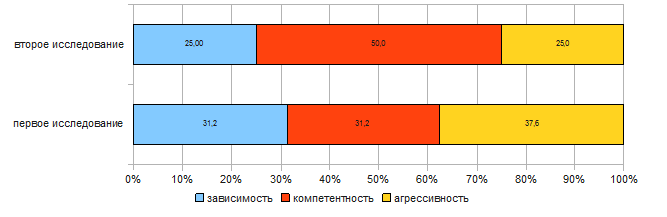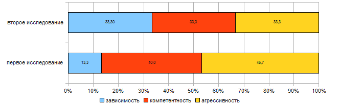 Преобладание показателей зависимости, агрессивности или компетентности в общении у студентов контрольной группы в первом и втором исследовании представлены на рис. 3.