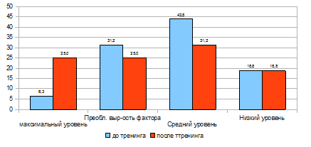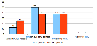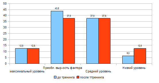 Среди студентов экспериментальной группы увеличился процент с максимальной выраженностью фактора С (с 12,5 % до 25 %) и снизился процент студентов с преобладающей выраженностью фактора (с 50 % до 37,5 %). Процент студентов, обладающих средним уровнем выраженности фактора С остался прежним (37,5 %).