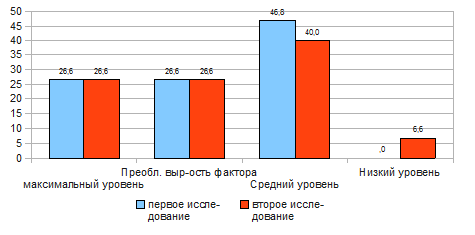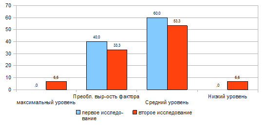 В контрольной группе в первом исследовании были выявлены студенты, для которых характерен только средний уровень выраженности фактора Д (60 %) и преобладание выраженности фактора (40 %). Во втором исследовании результаты распределились по всем уровням: максимально высокий уровень — 6,6 %, преобладание выраженности уровня — 33,3 %, средний уровень — 53,3 % и низкий — 6,6 %.
