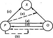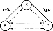 Теория «балансных моделей» утверждает, что сходства в аттитюдах относительно важных объектов (включая самих себя) усиливает взаимное тяготение. Эта теория предполагает действие трех основных компонентов, соотношение которых и регулирует притяжение-отталкивание(данная личность Р, другая личность О и некоторый неличный объект X, например обсуждаемый вопрос). Схематически элементы системы отношений могут быть представлены следующим образом (рис. 2.1).